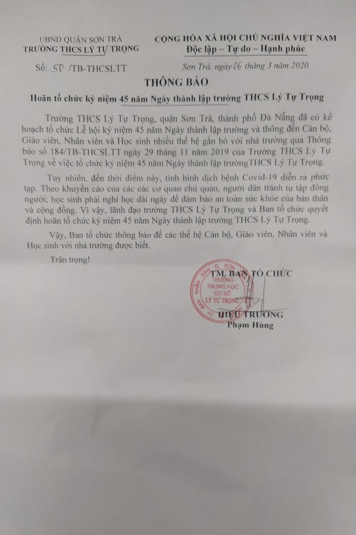 - Kế hoạch tổ chức kỉ niệm 45 năm thành lập trường THCS Lý Tự Trọng (29/11/2019)